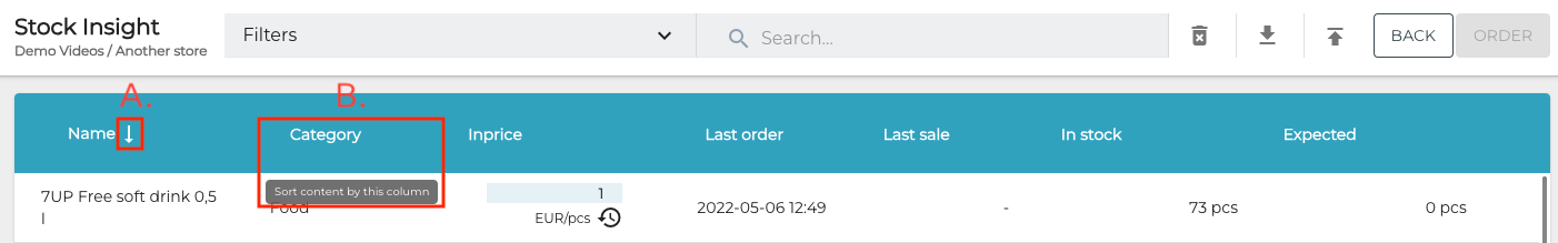 The arrow icon next to the column header (A.) indicates that the column is used as the sorting criteria. Click on the arrow icon to sort the information in either ascending or descending order.