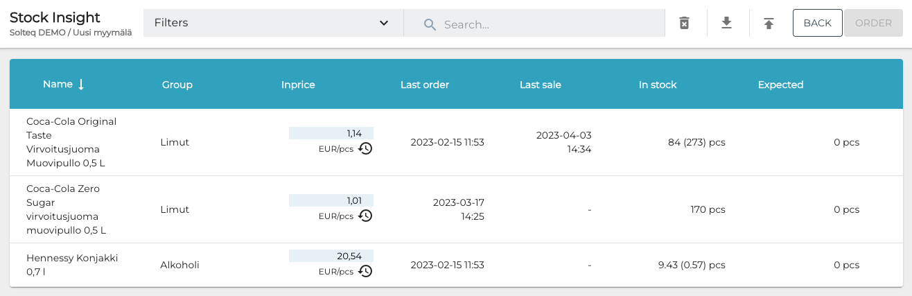 In the Stock Insight view you can view the current stock balances of products, as well as update the inprices of stock items. You can also export and import stock item information in Excel form, enabling mass editing of stock items, for instance.