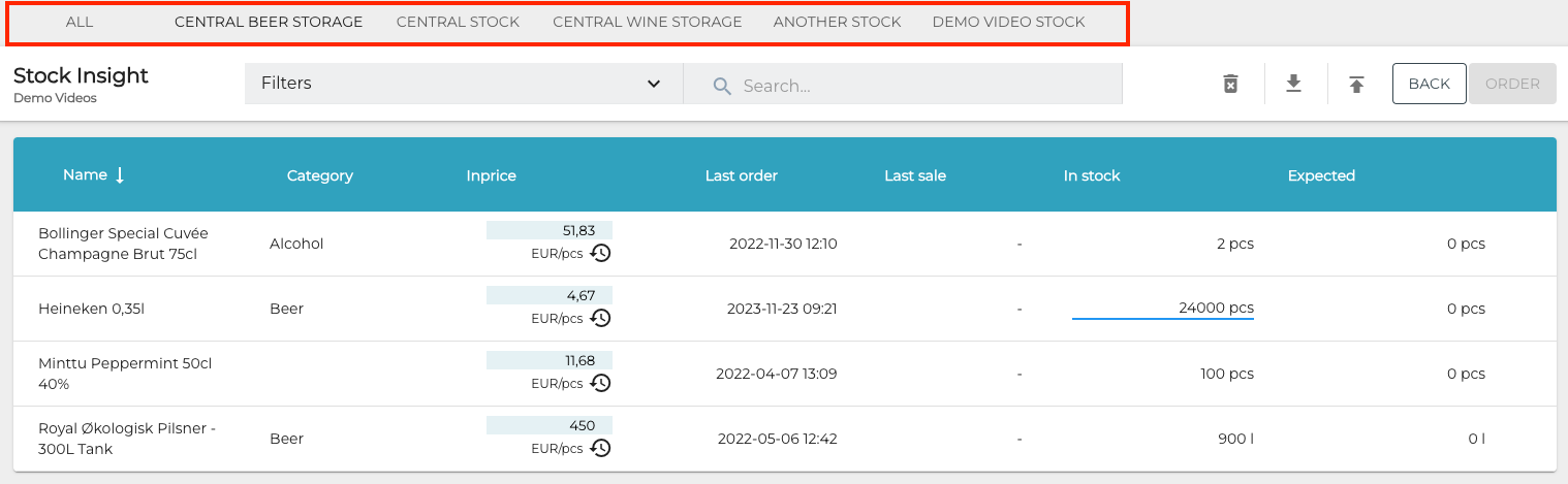 If the Stock you selected has not been not allocated to any Store (that is, it functions as a central Stock), you can switch between Stock Insight views: select another Stock or view all stock information by selecting a tab.