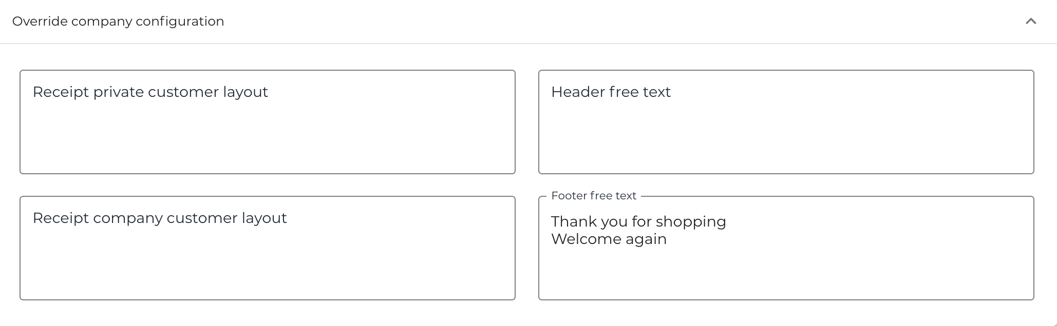 You can create company-level receipt texts and layouts in Company Configurations. Creating store-specific receipt layouts and texts is recommended only if you need store-specific layouts and texts.