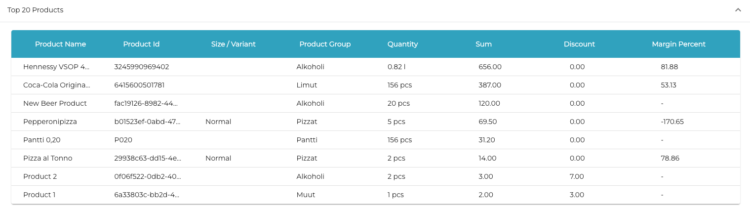Top 20 Products lists the products with the most sales during the selected time period; you can also use additional criteria such as Company, Store. Cost Unit, Workstation and User to filter the data.