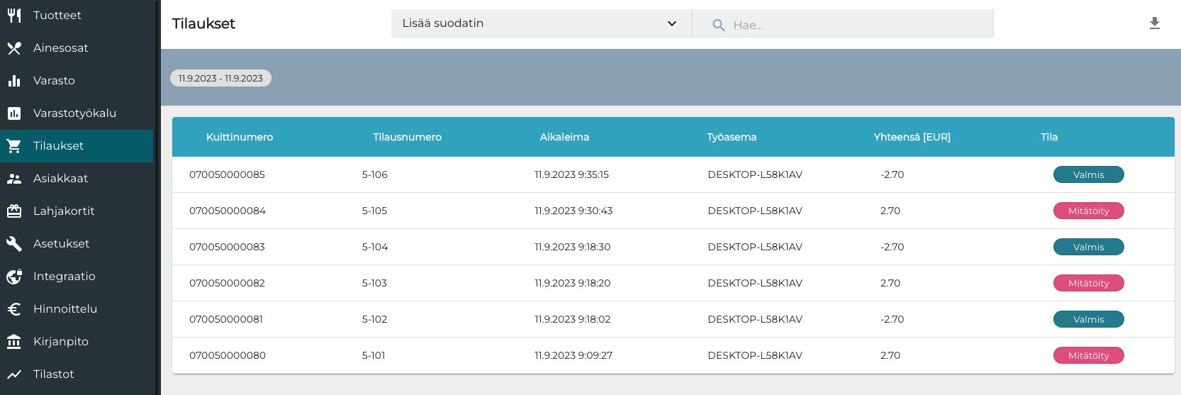 Työasema: työasema(t), jolla maksu suoritettiin ja kuitti tulostettiin. Huomaa, että tilaus on voitu alunperin tehdä eri työasemalla.